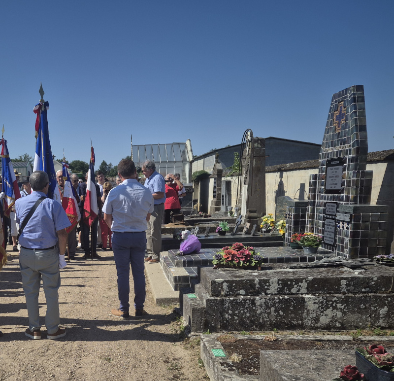 La commémoration du 81e anniversaire de la bataille de Bouillole s’est tenu il y a deux jours. Le matin, plusieurs dépôts de gerbes ont eu lieu aux cimetières de Theneuille et de Cérilly. L’après-midi, à 18 h, un autre rassemblement s’est tenu devant la stèle de Bouillole en présence des élus, des associations et de la population. Nous y étions. Ce 8 août, nous avons pu aussi présenter, dans le salon d’honneur de la mairie de Cérilly, notre exposition sur la libération des camps nazis, le récit bourbonnais.